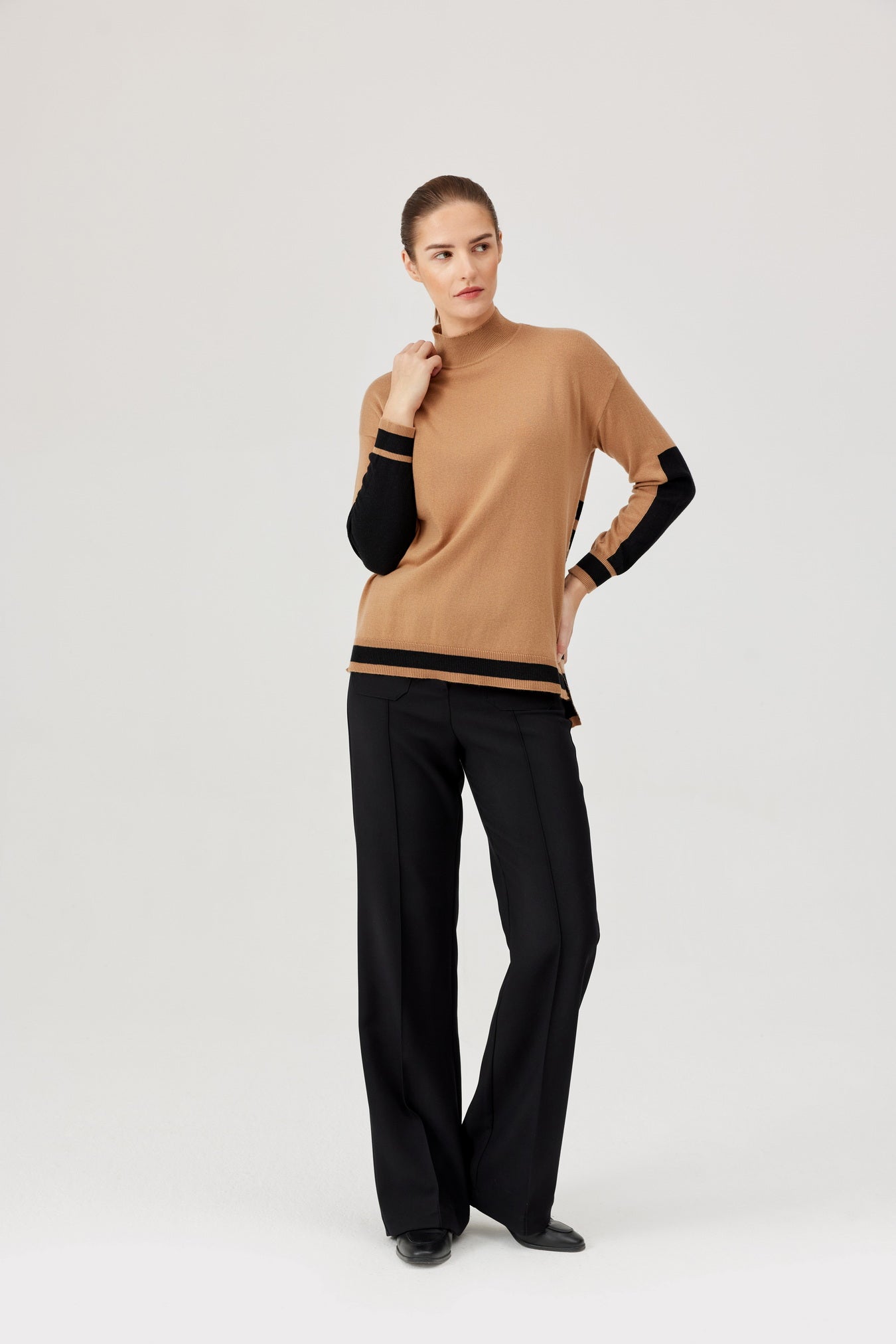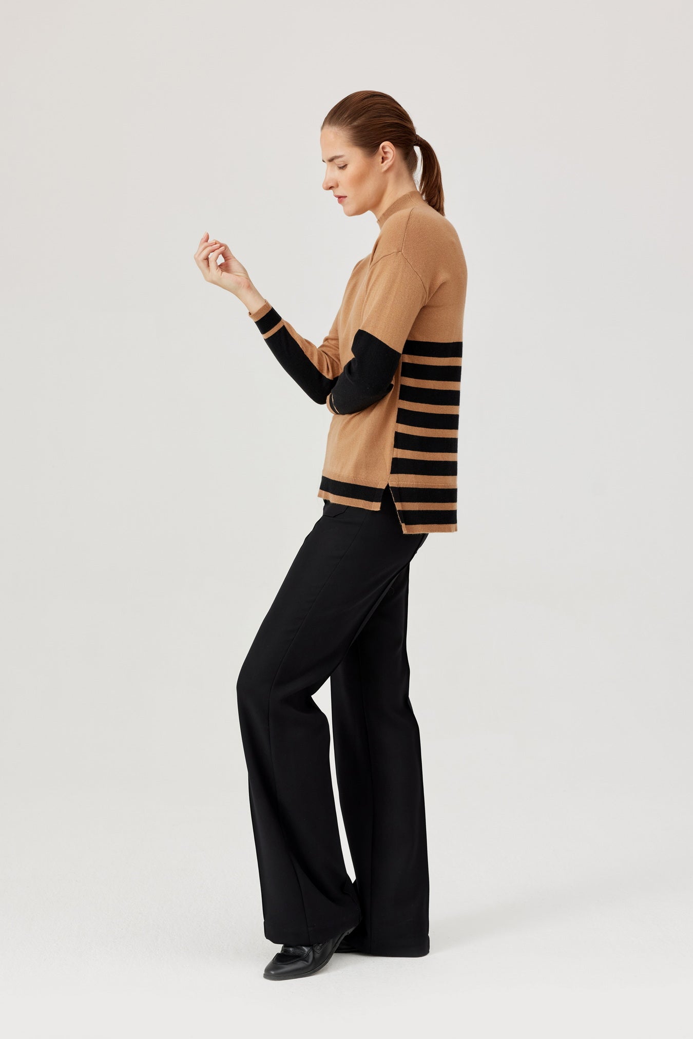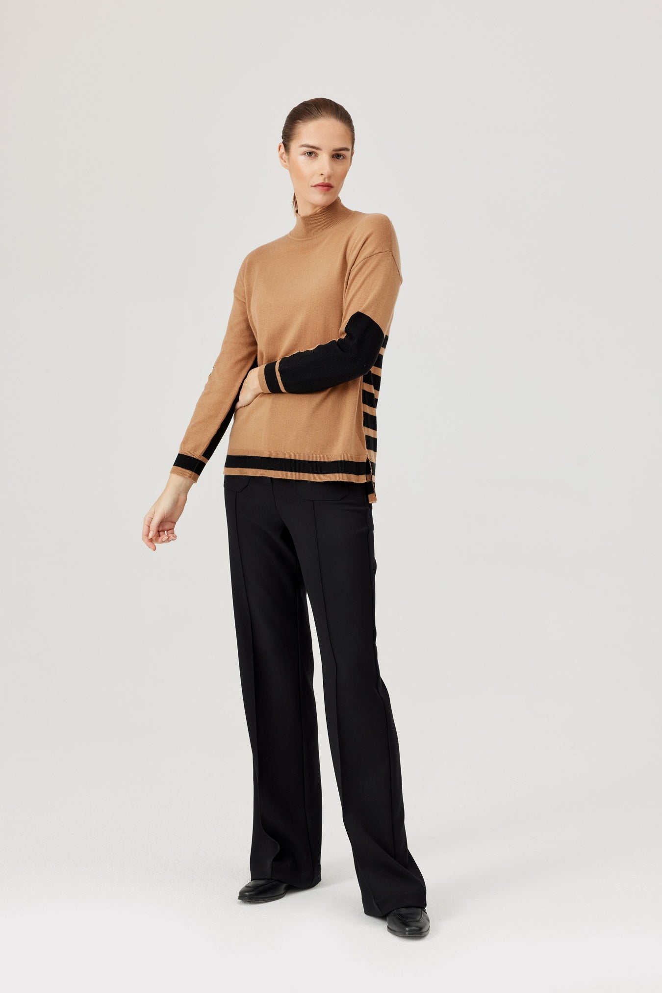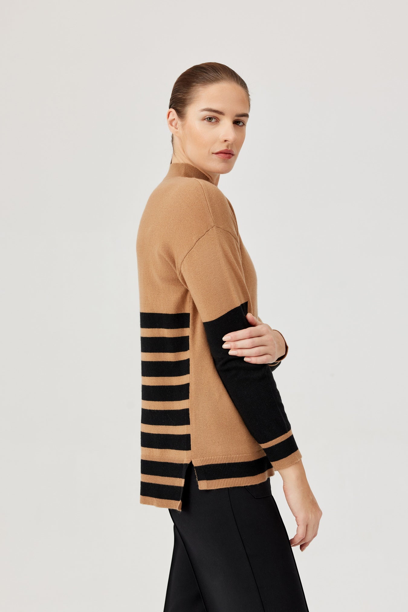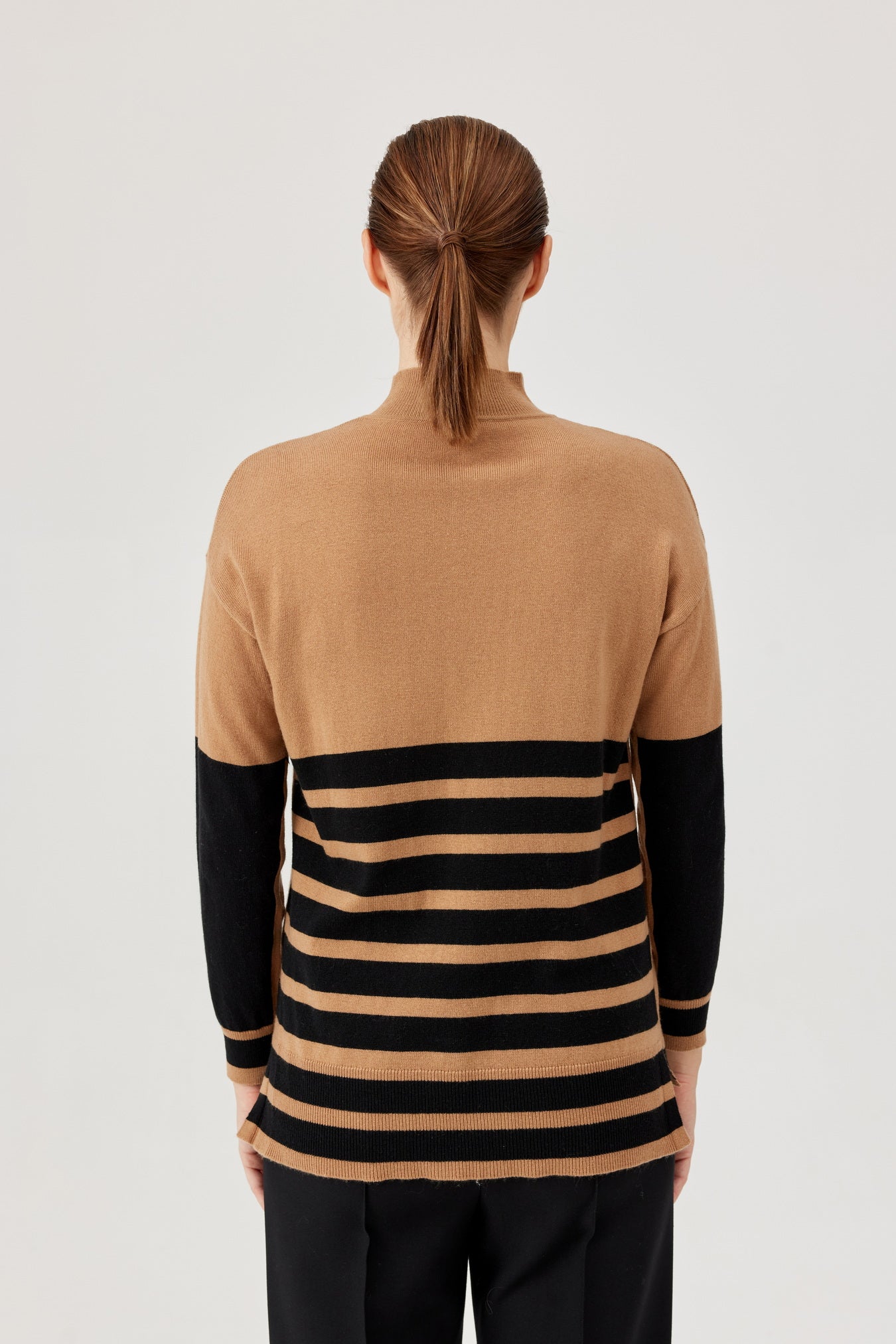 Meet your new favourite sweater from Feria ! The FÉRIA striped sweater blends cosy beige softness with striking black stripes for a fun, modern look. Its straight cut and mock turtleneck keep things chic, while the playful stripes at the back add a stylish surprise. With comfy side slits and long sleeves, it’s ready for all-day wear—whether you’re pairing it with jeans, sleek pants, or a skirt. Dress up or down, this sweater makes everyday feel effortlessly cool. Shop Feria in Sola Boutique this season.