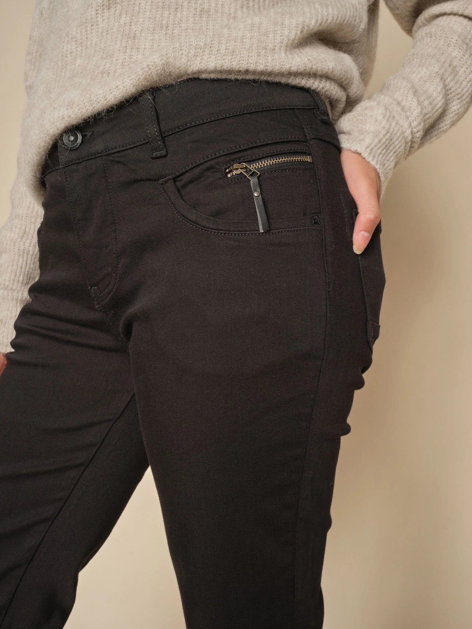 Upgrade your denim game with the Carla Deluxe Jeans in black from Mos Mosh. Their regular fit and high rise design are both stylish and comfortable, while the viscose, cotton, and lyocell blend ensures a soft touch. With pockets placed lower on the hips and a unique zipper detail, these jeans add a touch of cool to any outfit. Pair with a boho blouse for a complete look.