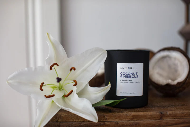 Get lost in the tropical paradise with Coconut & Hibiscus from La Bougie. This unique fragrance, crafted by perfumer Lucy Hagerty, captures the essence of the Indian Ocean with notes of salty coconut, night blooming jasmine, and ylang ylang. Enjoy 50 hours of beautiful burn time with this 220g candle. Paradise awaits!