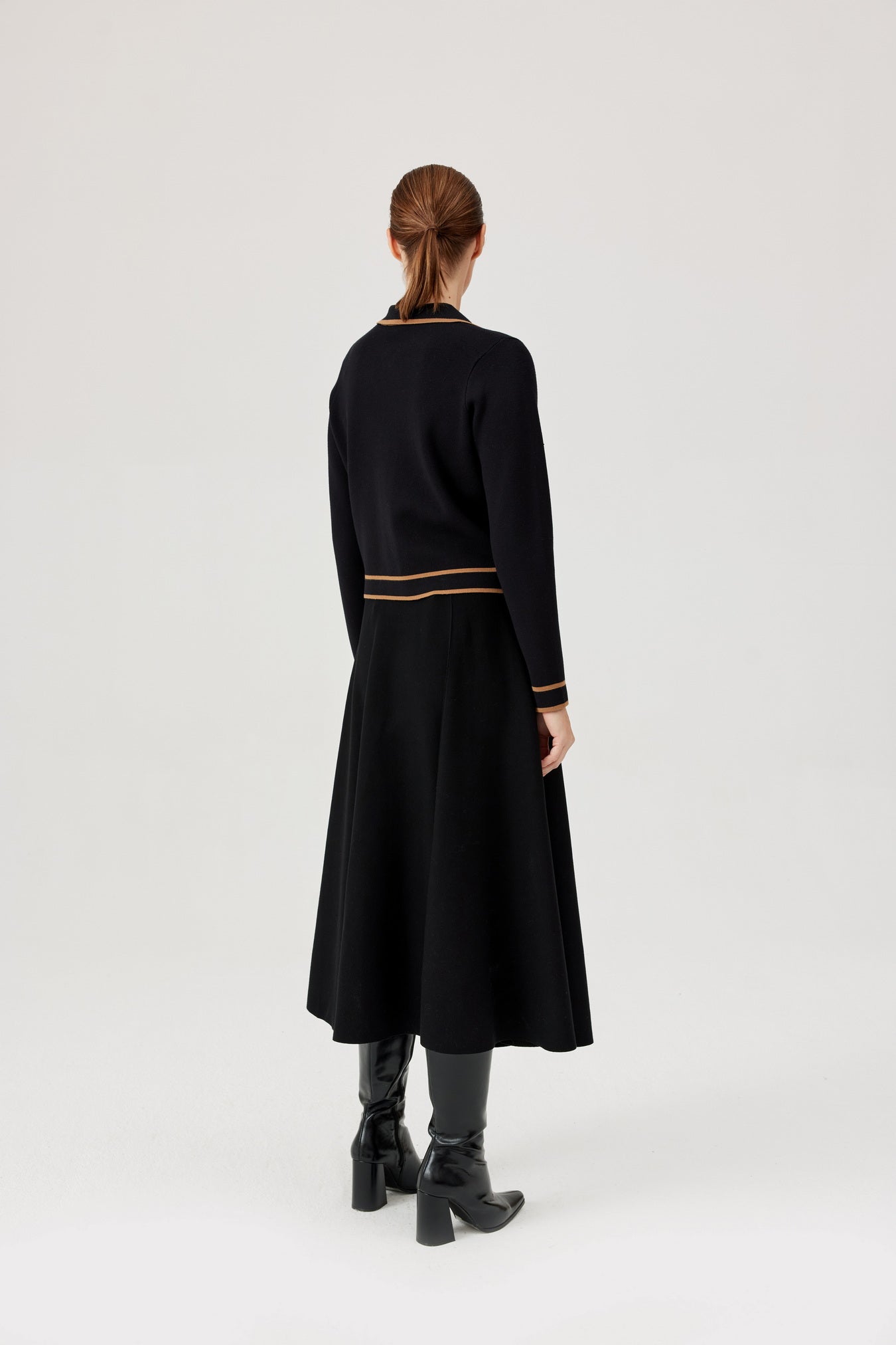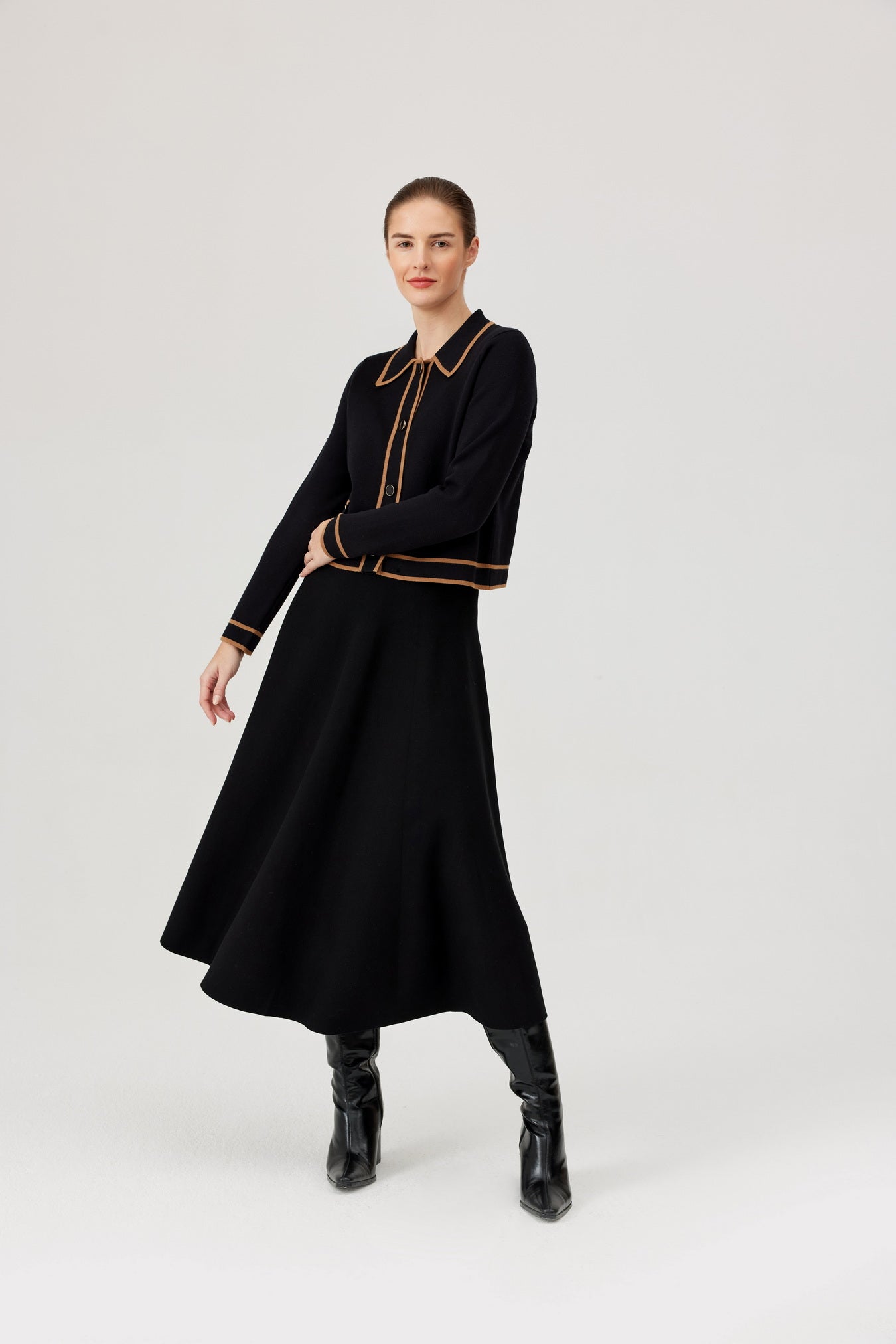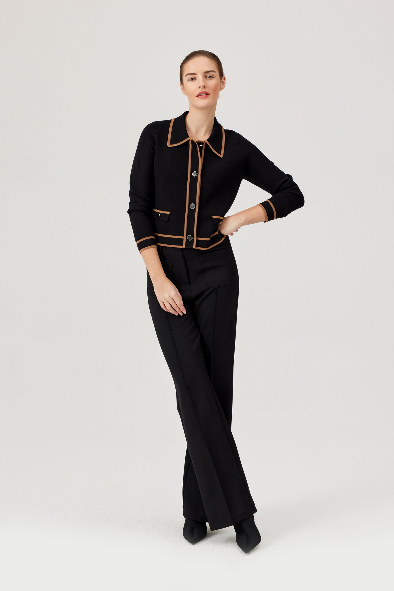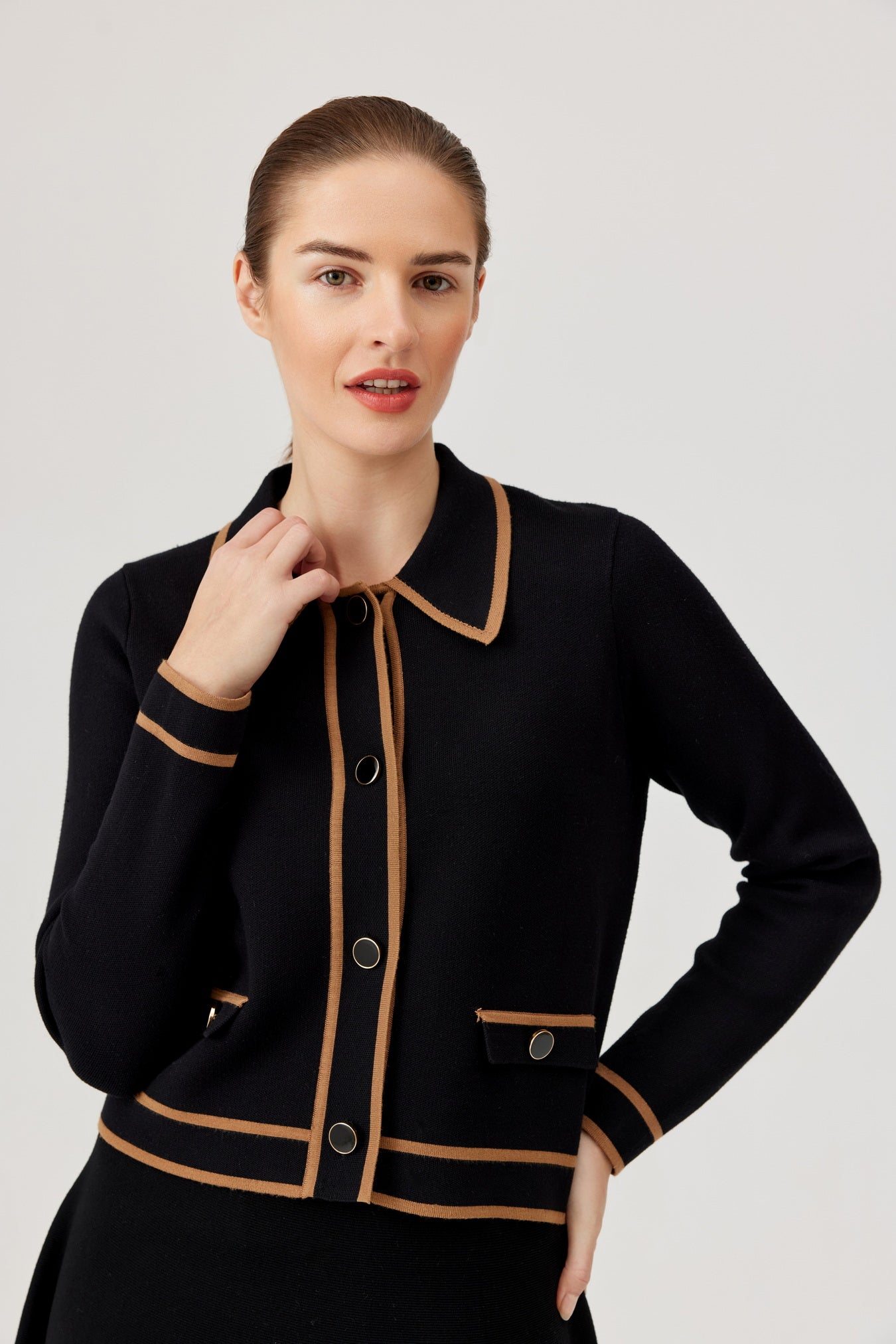 Meet the Feria Cardigan: a chic black knit jacket with eye-catching caramel piping that adds a fun twist. Decorative buttons and flaps give it plenty of personality, while the classic collar keeps it classy. Made from soft viscose, it’s comfy enough for all-day wear—whether you're heading to the office or out for a casual stroll. Pair it with trousers or a skirt for an effortlessly stylish look! Shop Feria in Sola Boutique this season .