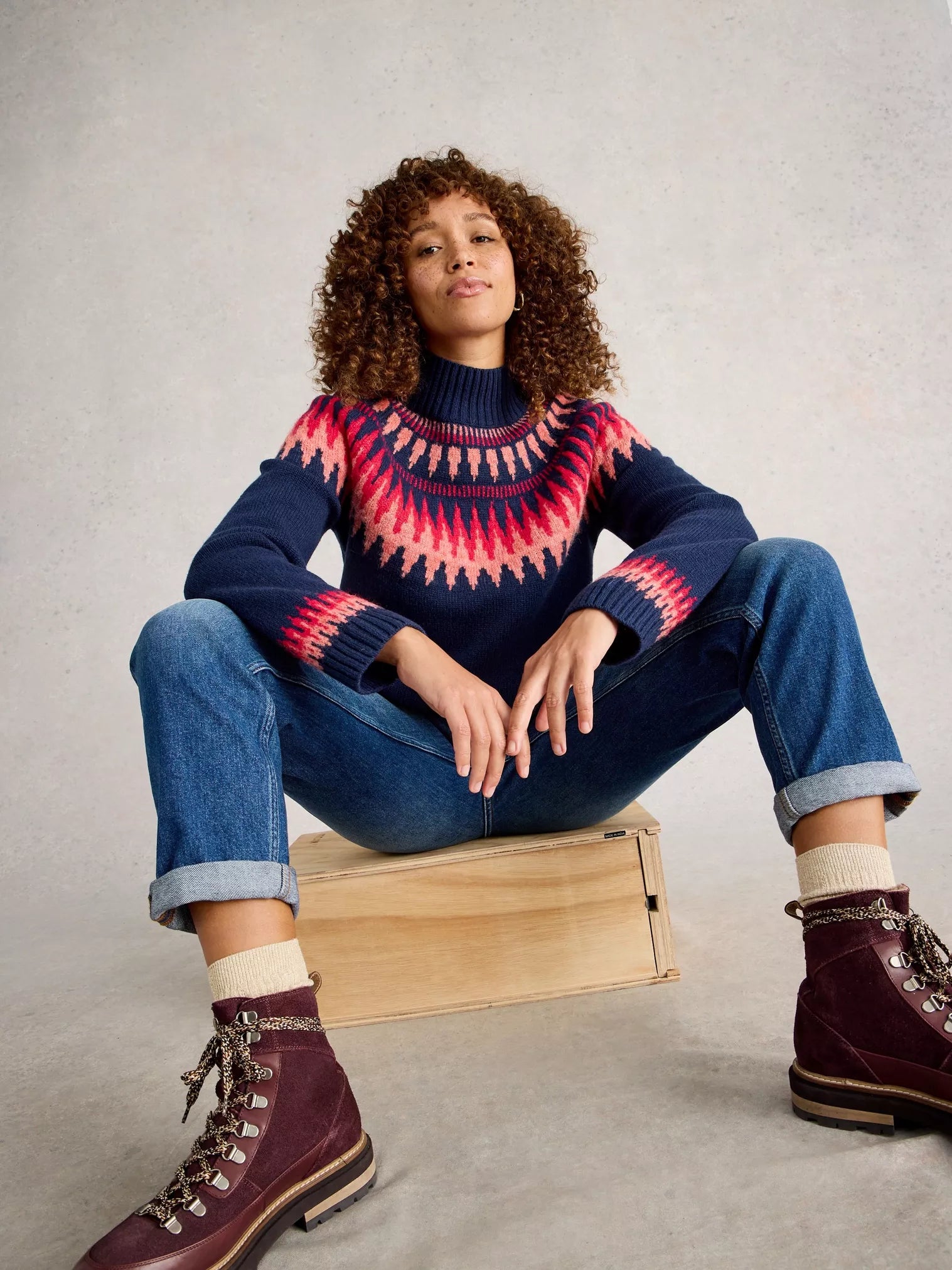 Look on the bright side with the Fiona Jumper, a cheerful fairisle design that brings warmth and personality to your wardrobe. Crafted from a luxurious lambswool blend, this cosy knit features a funnel neck and long sleeves in a regular fit that flatters effortlessly. The intricate stitchy pattern adds visual interest, while the premium fabric mix—including nylon, polyester, and a touch of metallised fibre—ensures durability and a subtle shimmer. Perfect for layering through autumn and winter, this jumper combines comfort with playful style. Shop White Stuff in Sola Botuique, Bantry this season.