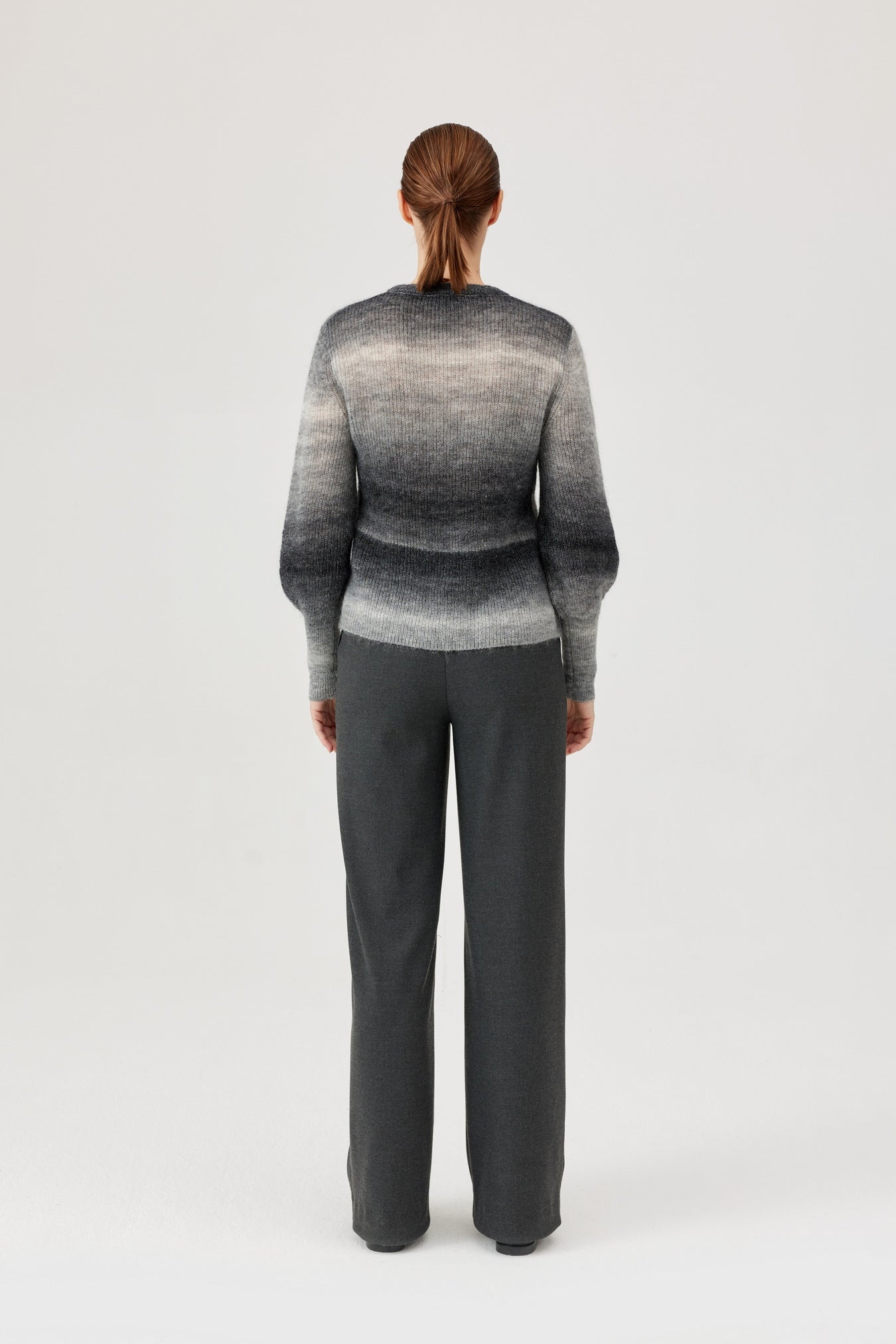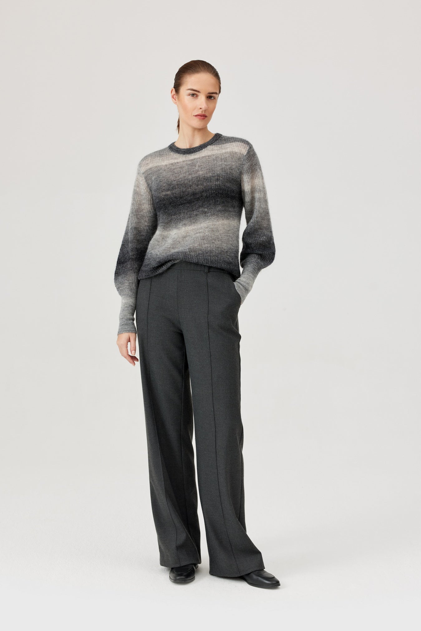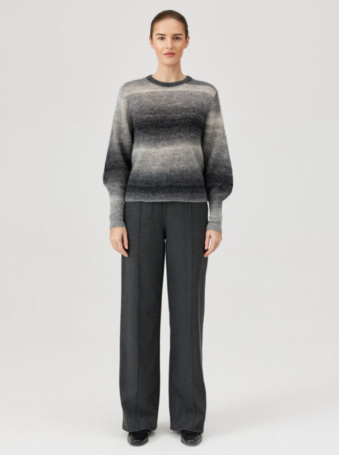 Stunning mixture of grey colouring in this jumper from Feria. Crew neck line, wide cuff detail.