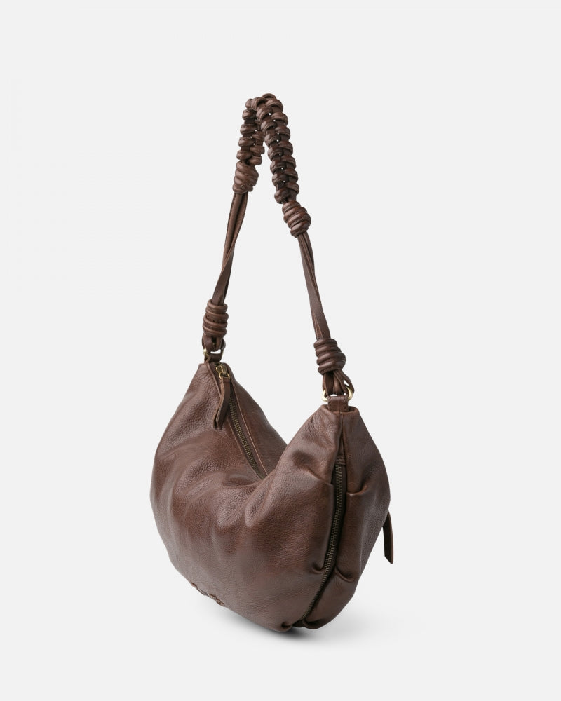 Washed cowhide leather hobo bag. Beautiful hand-braided gusset and shoulder strap. Zipper closure, adjustable and removable crossbody strap, external and internal pockets, and cotton lining.