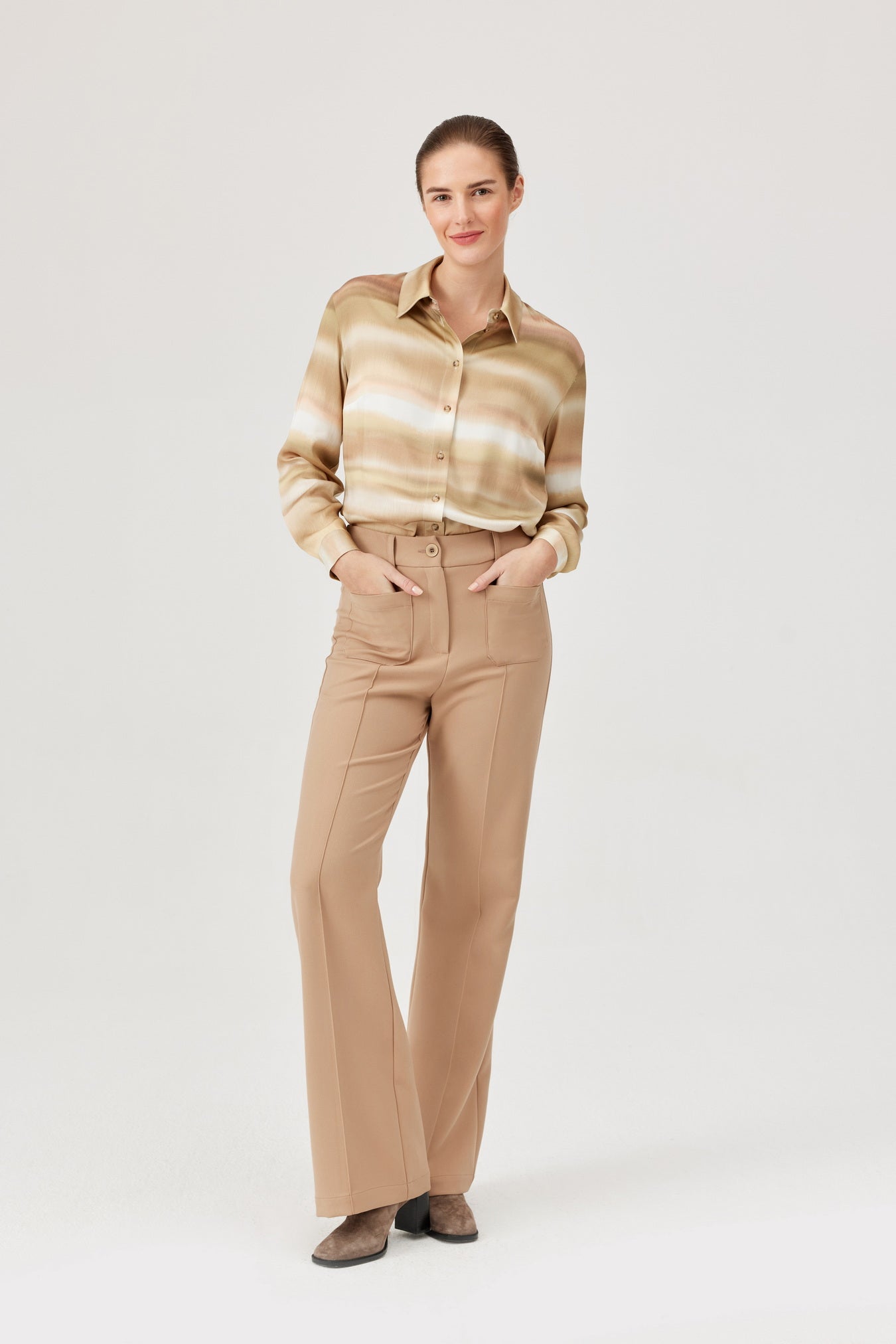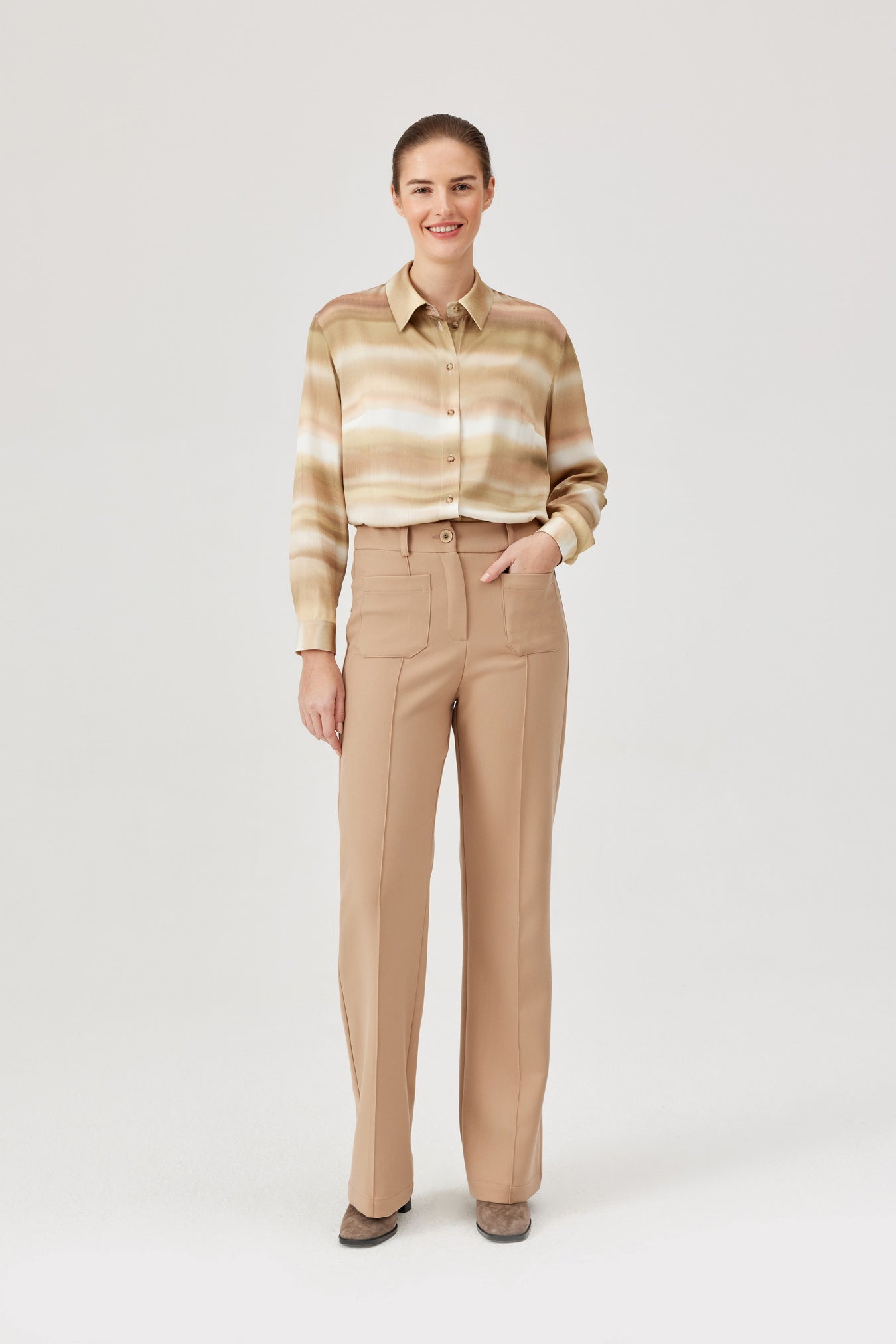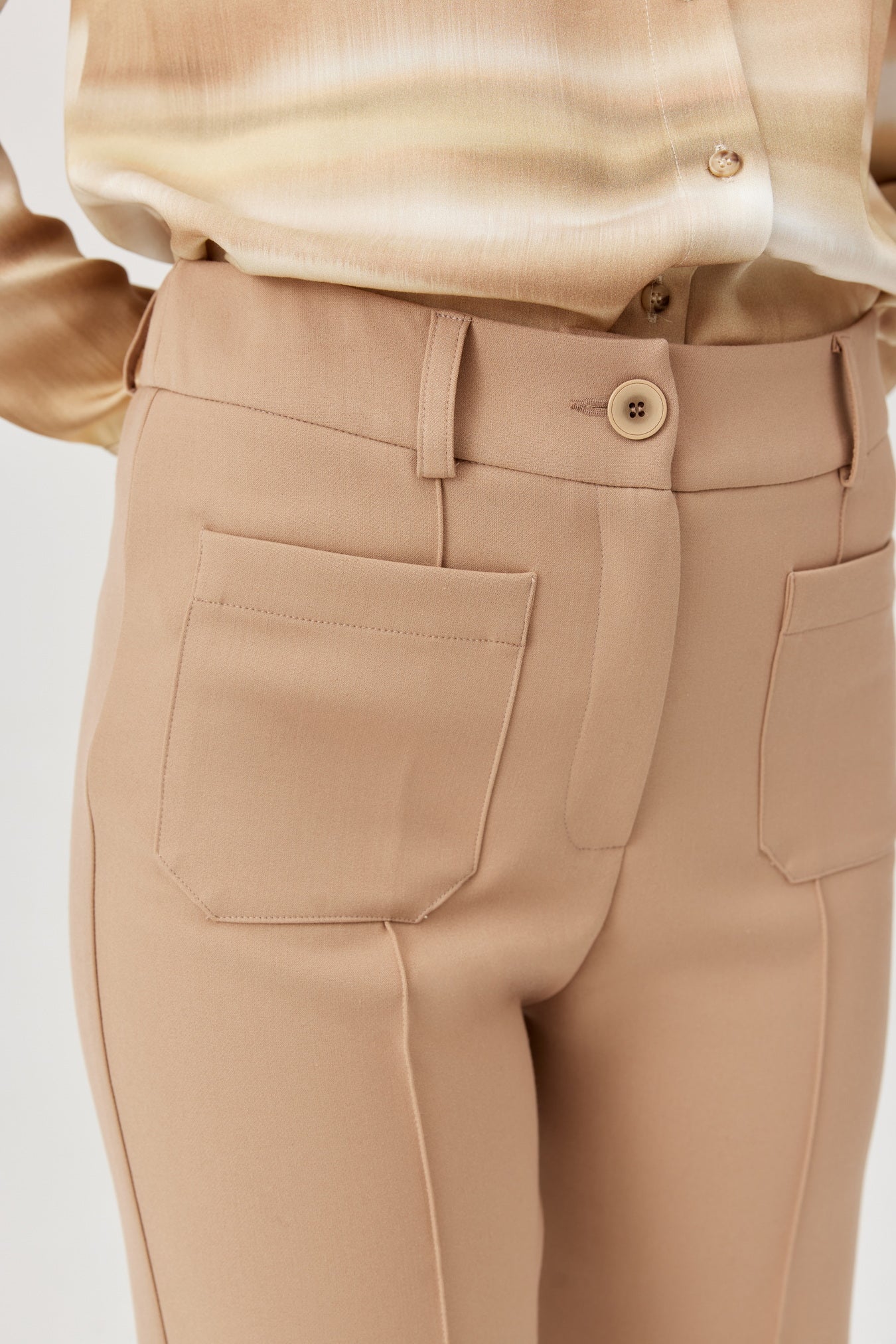 Step up your style game with these FÉRIA straight-leg trousers in a sleek camel. The high waist and classic cut create a flattering silhouette, while the smooth, slightly stretchy fabric keeps you comfy all day long. Front patch pockets add a cheeky twist, and the sharp crease helps your legs look endlessly long. Perfectly playful yet polished, these trousers will have you conquering the office and beyond with ease. Shop Feria in Sola Boutique this season.