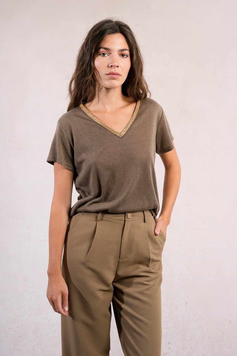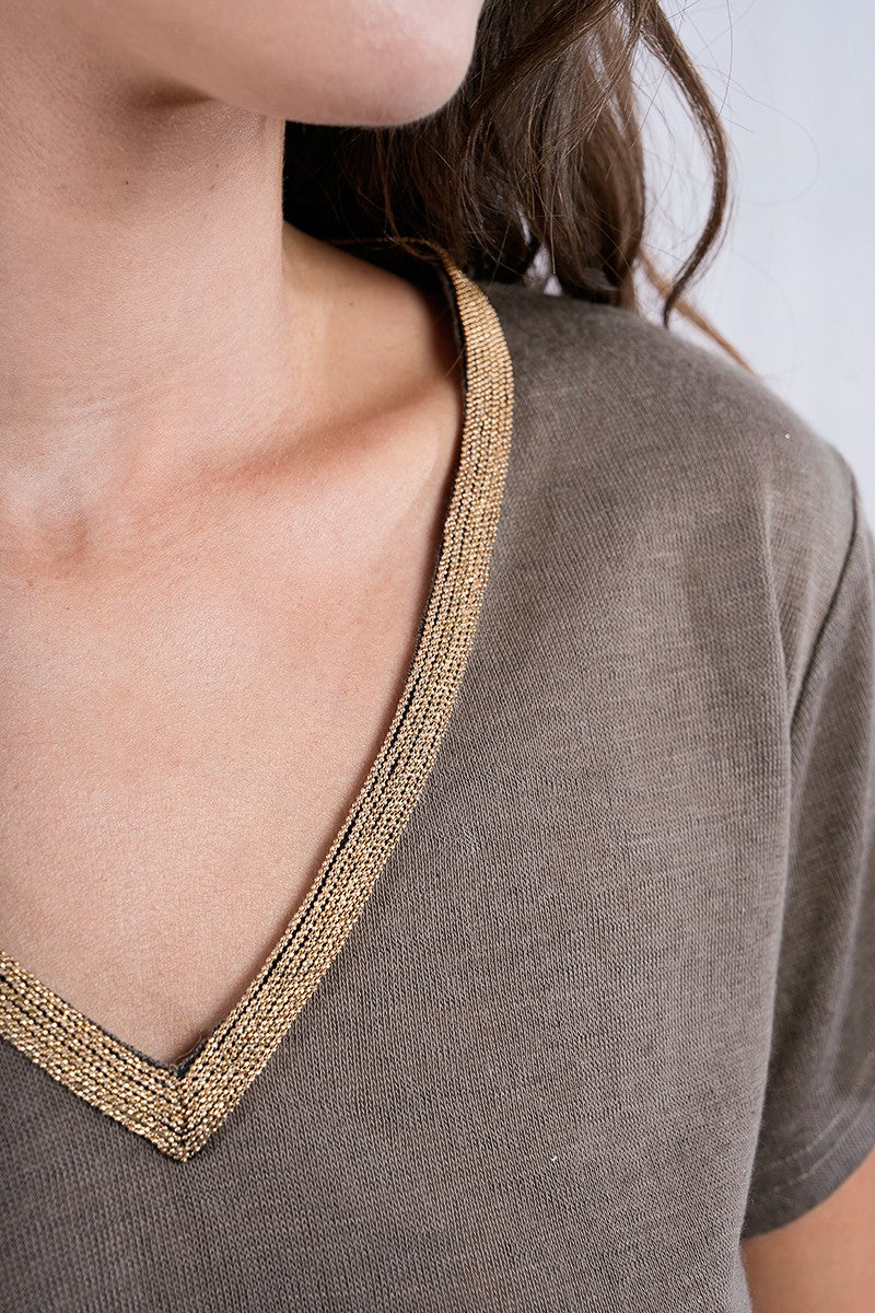 Turn heads with this playful V Neck Tee in Khaki from Molly Bracken. Its straight cut and short sleeves promise all-day comfort, while the iridescent fabric strip along the V-neckline adds a fun, shimmering twist to your casual look. Perfect for brightening up your everyday style with just a touch of sparkle! Shop Molly Bracken in Sola Boutique this season.