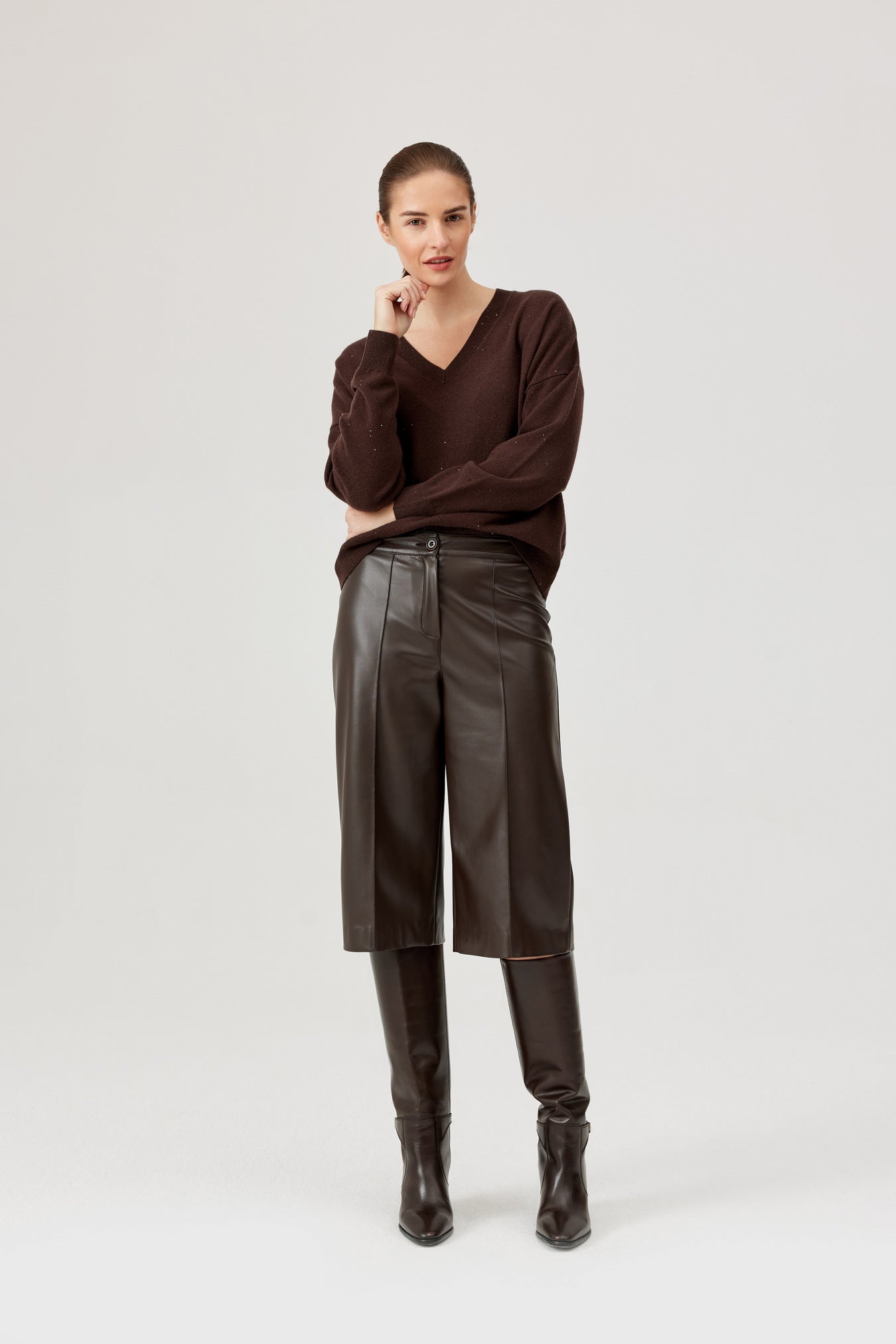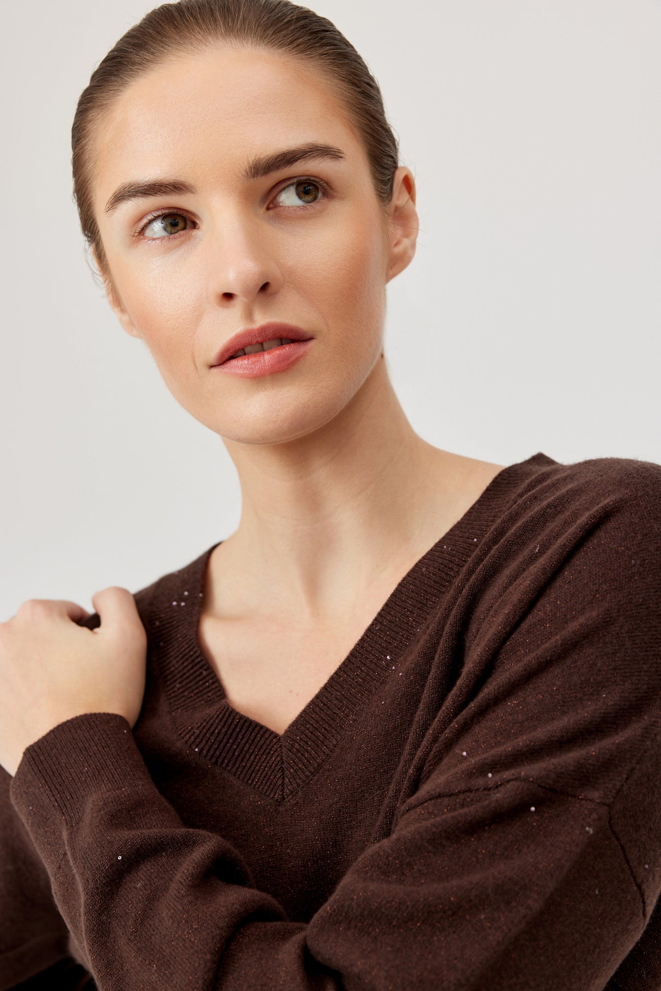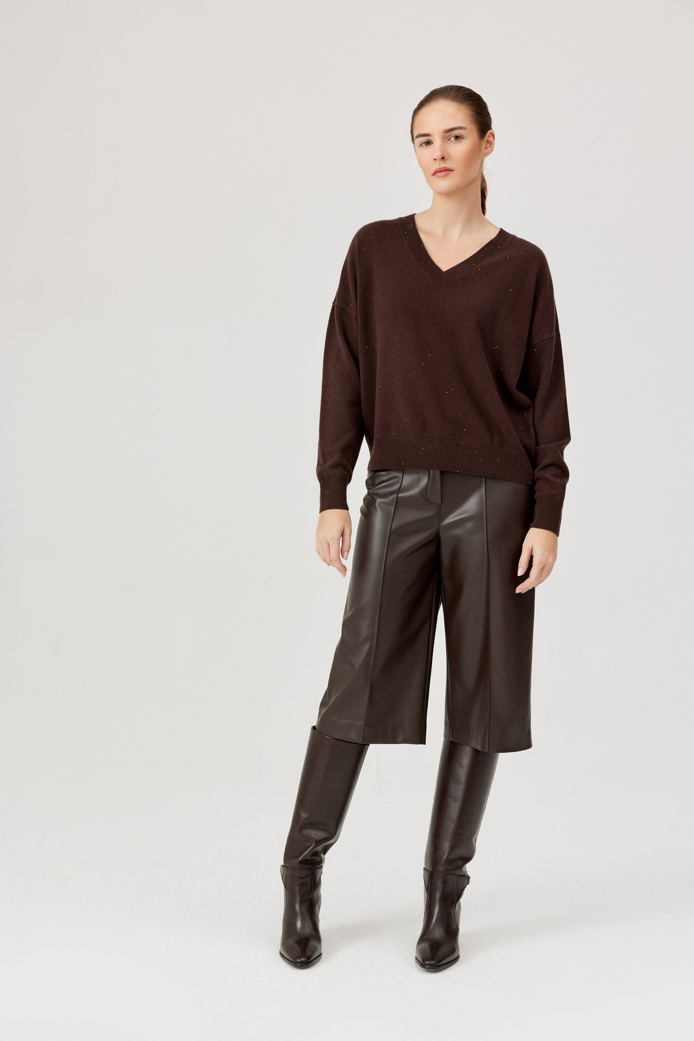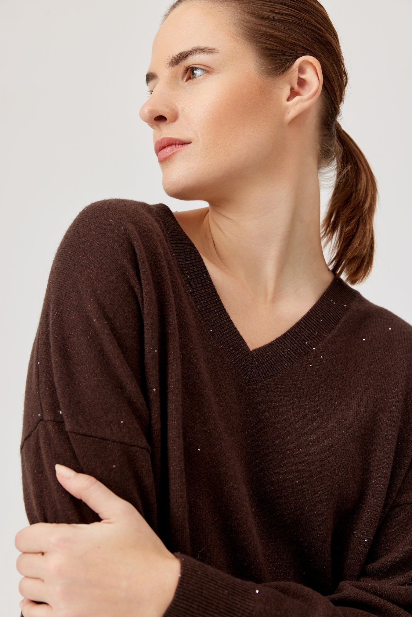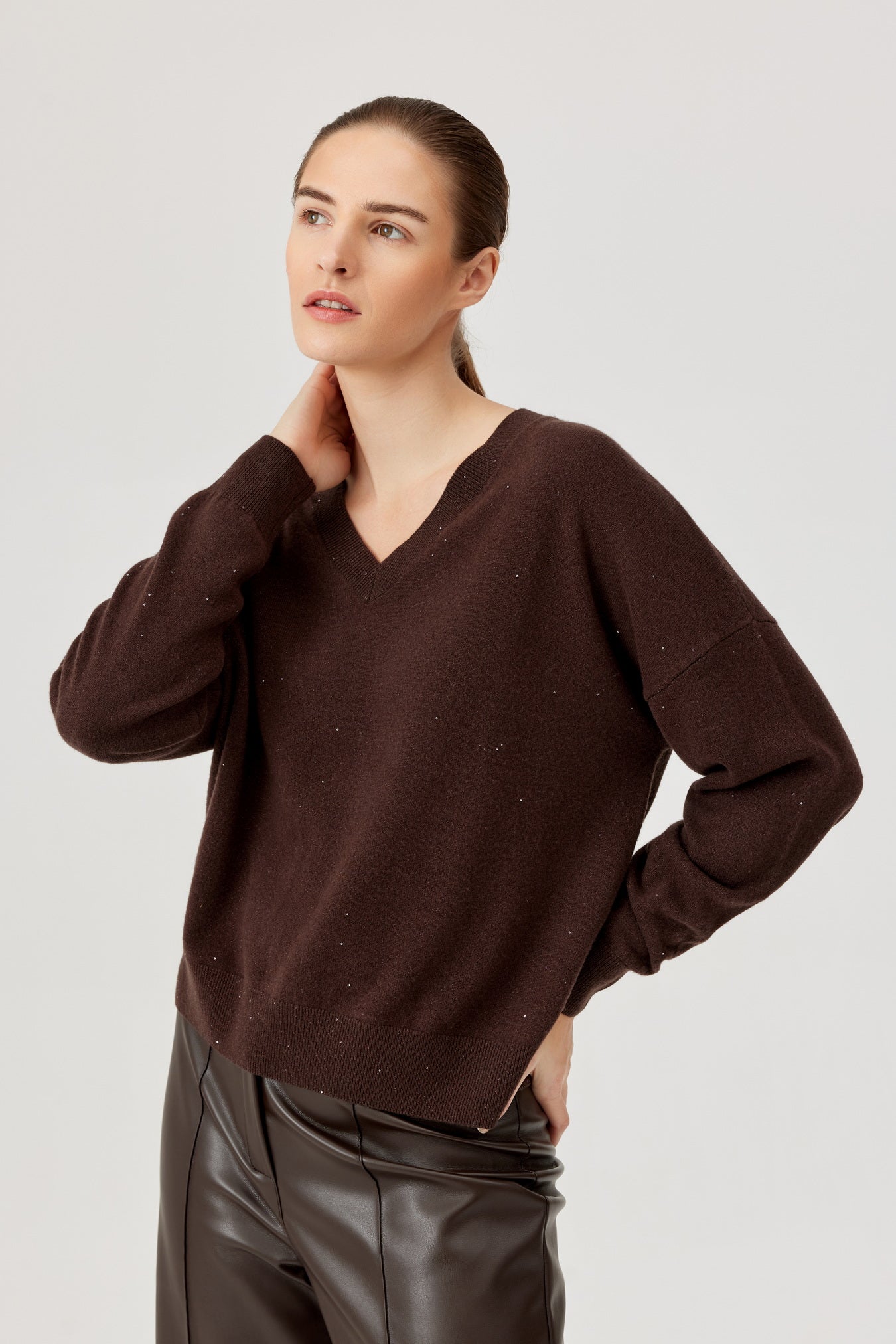 Meet the Viv Sweater from Polish brand Feria: your new go-to for cosy vibes .This chocolate beauty flaunts a relaxed fit, soft jersey fabric, and a flirty V-neck that’s perfect for layering or rocking solo. Dropped shoulders keep it effortlessly cool, while the ribbed hem adds just the right finish. Whether you’re teaming it with jeans, skirts, or trouser.