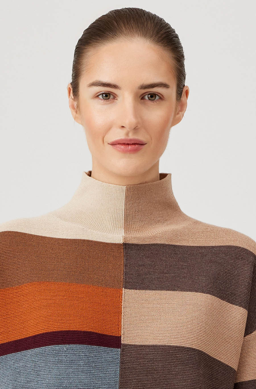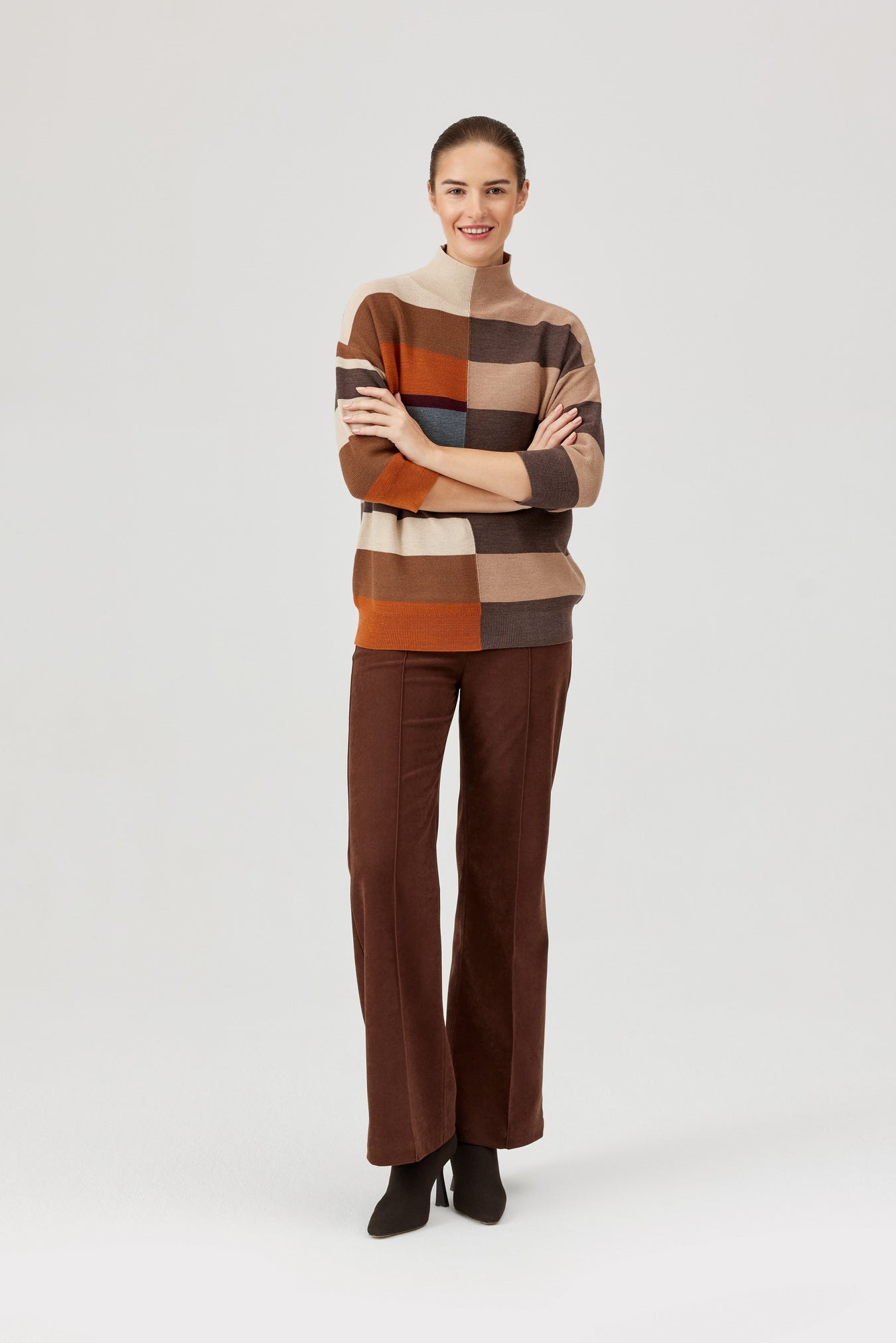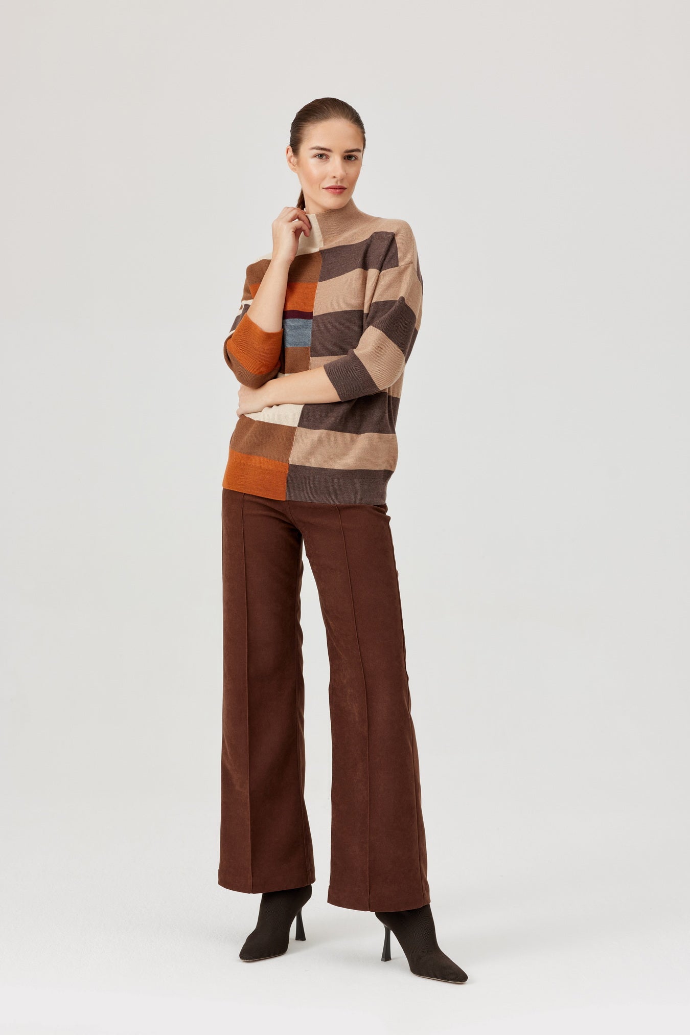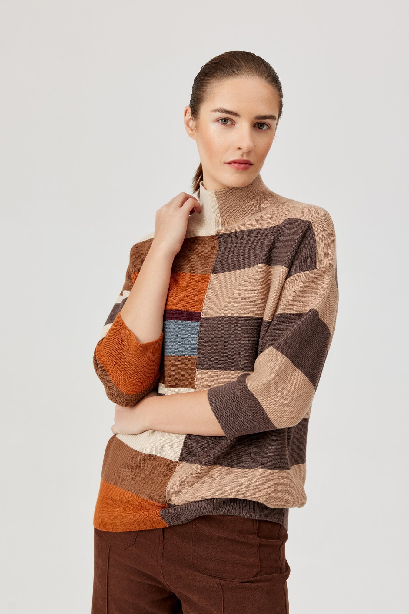 Bring some fun to your fall wardrobe with the Zoe Sweater from Feria! This cozy, loose-knit sweater wraps you in soft comfort while turning heads with its bold patchwork of wide stripes in beige, brown, caramel, orange, and gray-blue. Its playful asymmetrical design makes every outfit pop, whether paired with jeans, flowy pants, or a sleek skirt. Perfect for casual days, office vibes, or leisurely weekend adventures, the Zoe Sweater adds a splash of color and style wherever you go. Shop Feria in Sola Boutique this season.